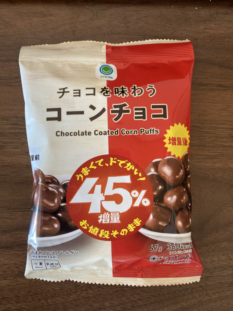 食後のおやつ用に「コーンチョコ」も買いました。どでかい「45%増量」の表示と赤い地色が目立ちます。増量後の内容量のほかに、カロリーも表記されていました。とても親切です。